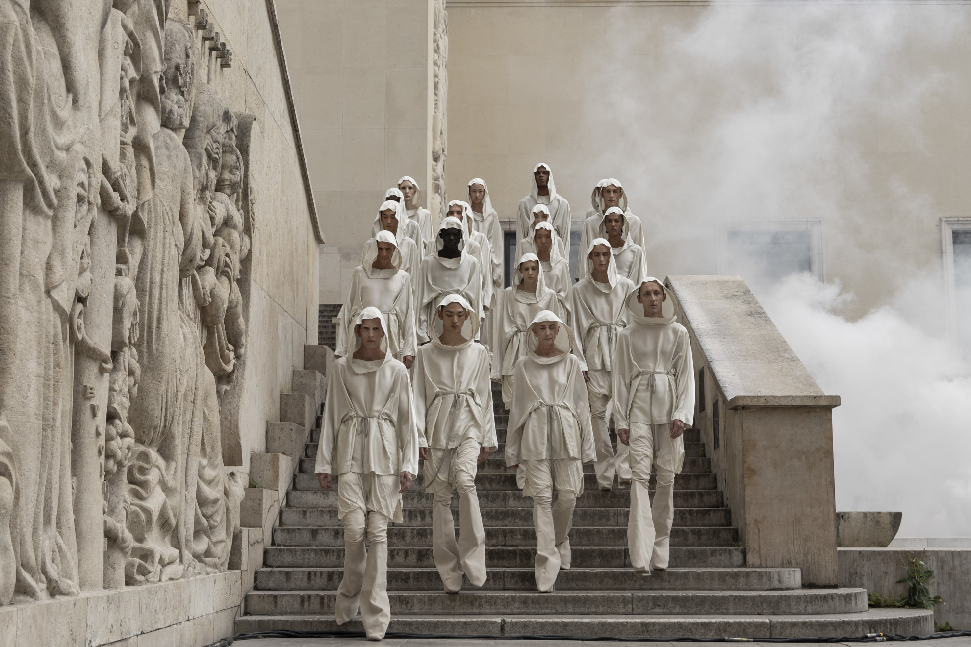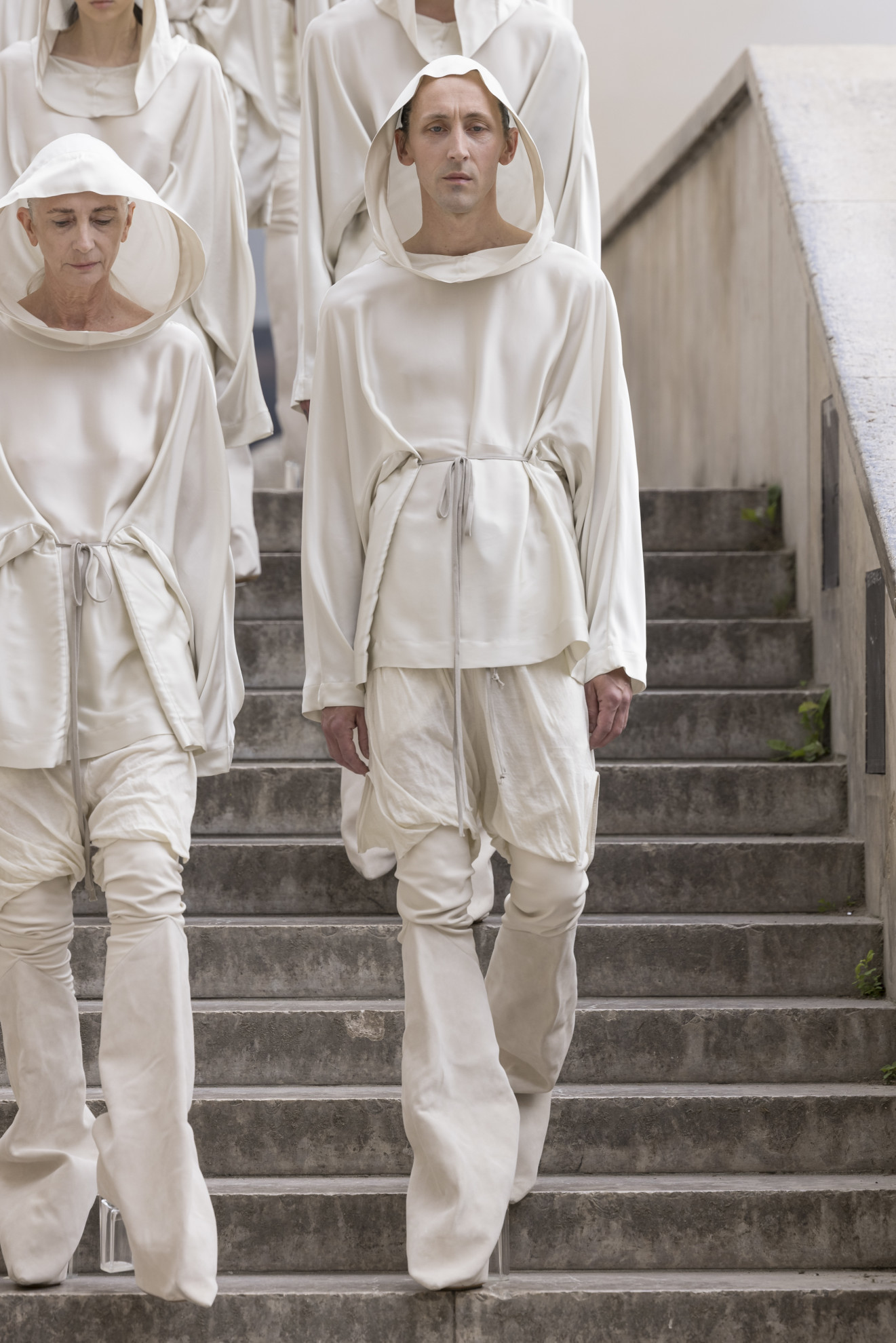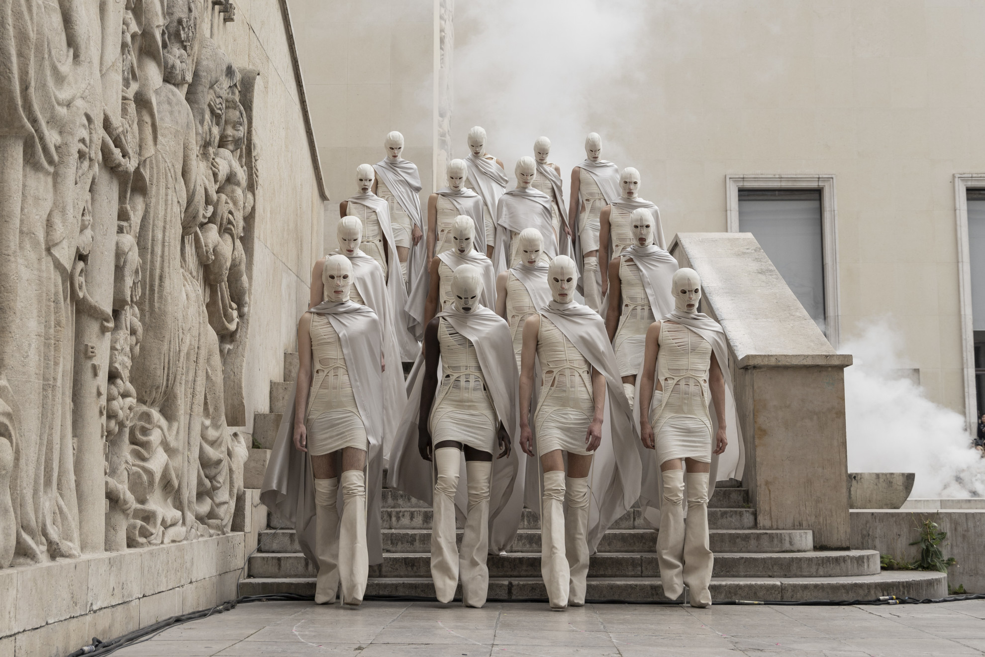 Rick Owens 2025 春夏系列秀在巴黎东京宫展览大厅上演,以贝多芬的第七交响曲 Allegretto 作为秀场背景音乐。此次大秀只有 10 个造型,但召集了约 200 名模特进行演绎。模特们以四人一排、五列纵队的方式出场,现场弥漫一丝神圣和严肃的氛围。其中出场的一组模特身穿 Tanja Vidic 设计的裹身针织衫、侧开衩短裤和 Geobasket 运动鞋,抬着三名穿着紧身胸衣的体操运动员,手举印有握手图案的旗帜,场面极其壮观。服装设计方面,系列包含了曾在以前作品中出现过的骑士和牛仔元素,包括附着厚重硬朗涂层的衣物,也有一些呈现出粉状、黏稠或金属质感的款式。鞋履再次出现去年充满话题性的充气靴,这次以全新皮革版本呈现。薄纱头巾环绕面部,肩部设计成惊叹号形状,增加戏剧效果。此次大秀通过多样化的模特群体展示了对身体类型的思考,体现了包容性和社群意识。通过多样化的展示,Rick Owens 再次挑战传统美学观念,鼓励人们思考不同的美学和相互对待的方式。